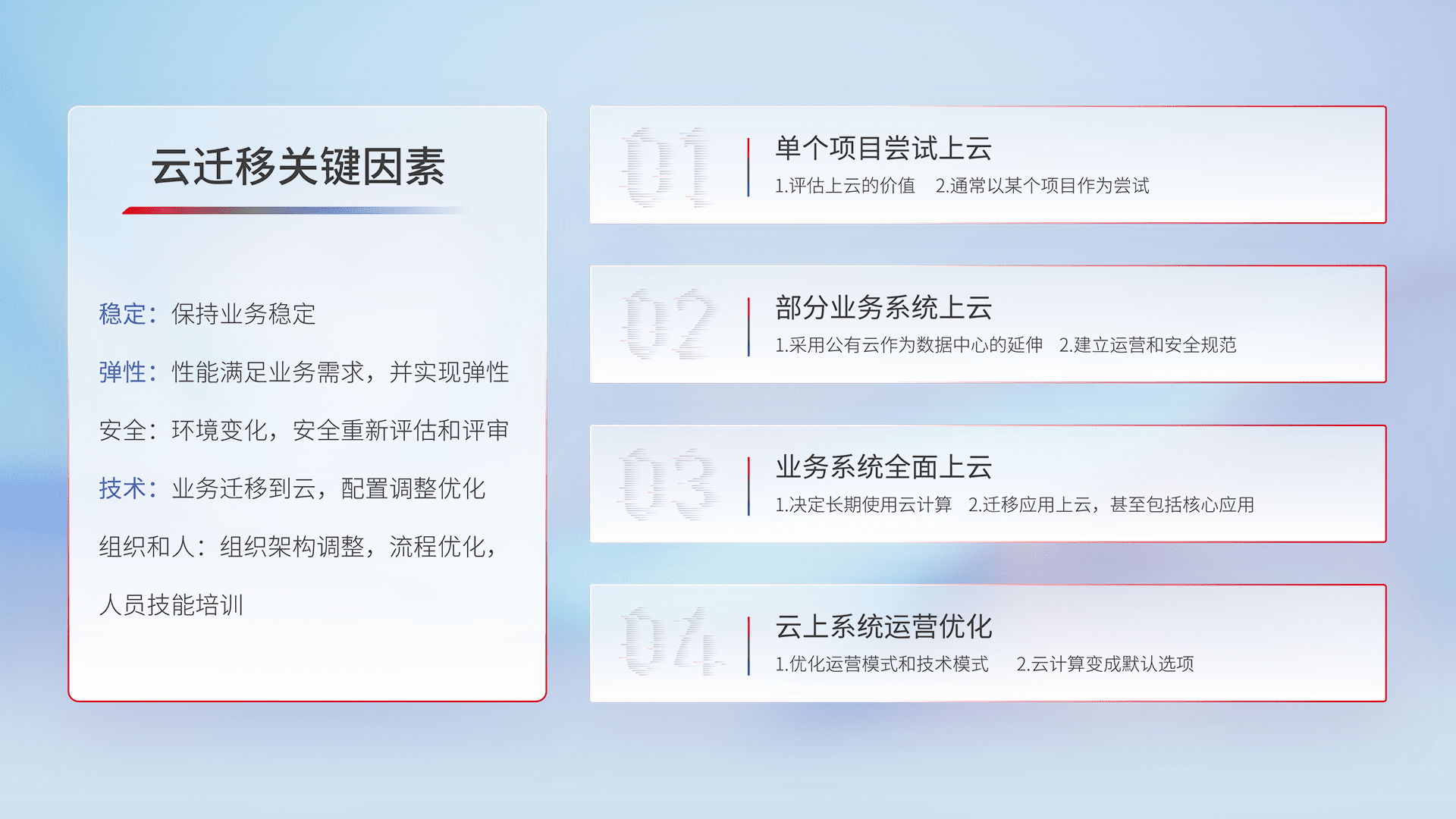 结合实际业务,,,从规划设计、、、云平台选型、、、、云原生改造、、、数据迁移、、、、集成交付,,,迁移全过程为客户识别最佳上云路径,,,做好风险识别管理,,,,设计网络架构、、身份权限、、、安全审计合规、、操作审计、、、、日志审计、、、监控告警策略、、多站点容灾设计等,,,,对云上基础设施进行整体规划,,,提升IT治理水平,,,,以满足弹性、、、高可用、、高性能的需求。。。。